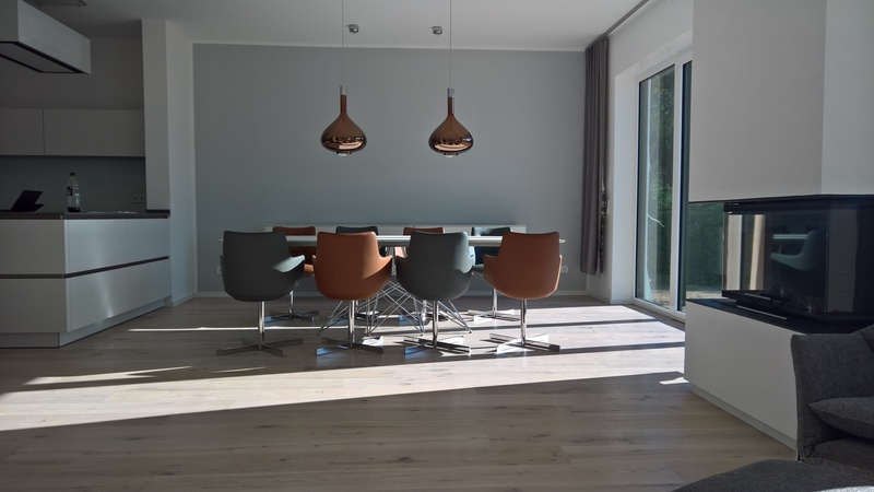 Durch die Verlegung der Küche wurde das etwas schmalbrüstige Wohnzimmer großzügig und bietet nun Platz für einen üppigen Estisch. Der Gaskamin sieht nicht nur gut aus, sondern spendet auch Wärme.
