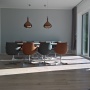 Die Mittelachse aus schlichtem Küchenblock und Tisch ist das puristische Konzept der Küche.